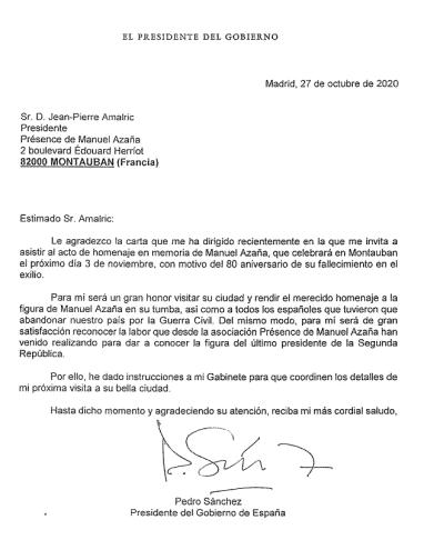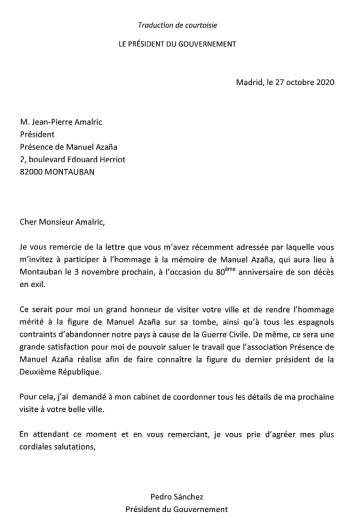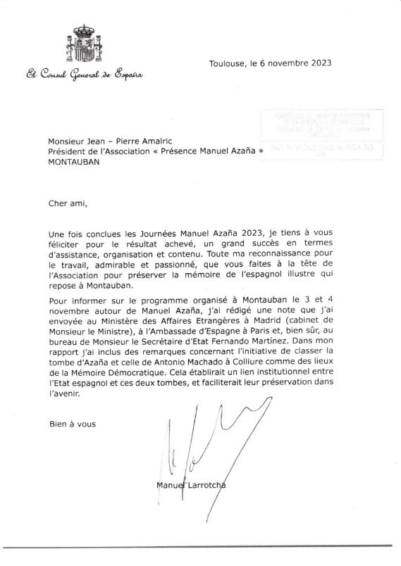 Le discours qu'aurait dû prononcer le secrétaire d'Etat espagnol à la mémoire démocratique et qui fut lu par le consul de Toulouse ainsi que le courrier qu'il a envoyé au gouvernement espagnol.