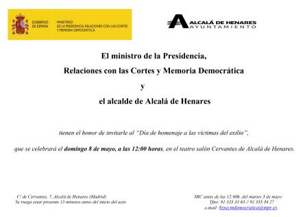 Le gouvernement espagnol a décidé de célébrer chaque année, le 8 mai, une journée d'hommage à l'exil espagnol. Cette année "Présence de Manuel Azaña" a été invitée à participer à ce Día de las víctimas del exilio par le ministre de la Présidence Félix Bolaños et le secrétaire d'Etat à la mémoire démocratique Fernando Martínez et à y prendre la parole. Le président et la vice-présidente de l'association, Jean-Pierre Amalric et Geneviève Dreyfus-Armand, ont ainsi pris part à la cérémonie qui s'est tenue à Alcalá de Henares devant un public attentif et recueilli.