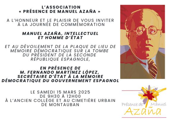 Nous avons le plaisir de vous inviter à la journée de mémoire et d'hommage consacrée à "Manuel Azaña, intellectuel et homme d’État" qui aura lieu le samedi 15 mars de 9h00 à 12h00 à Montauban. A cette occasion, le gouvernement espagnol, représenté par M. Fernando Martínez López, secrétaire d’État à la Mémoire Démocratique, dévoilera la plaque de lieu de Mémoire démocratique en exil sur la tombe du président Manuel Azaña.